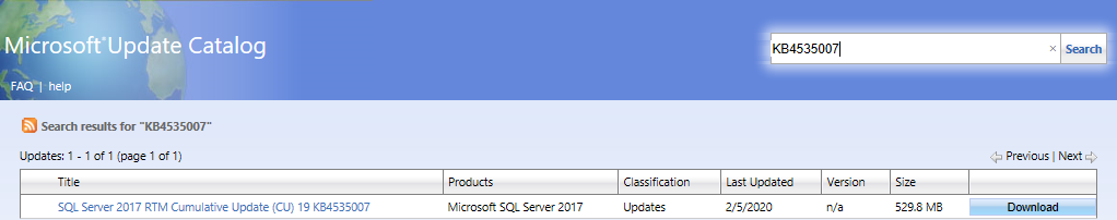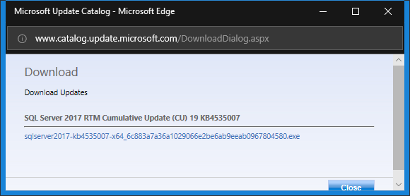 The function works reliably up to this point, and then fails here intermittently. So I went to the Microsoft Catalog website, which the function downloads the file from, and tried to do it manually. The KB I was downloading is KB4535007, CU19 for SQL Server 2017. The search worked fine, and I clicked download here;
